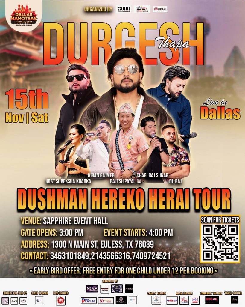 डलास, टेक्सास — अमेरिकाको डलासमा यही आउने नोभेम्बर १५, शनिबार नेपाली संगीतप्रेमीका लागि उत्सवमय साँझ तयारीमा छ। चर्चित गायक दुर्गेश थापा, सदाबहार स्टार राजेश पायल राई, लोकप्रिय गायक किरण गजमेर, र गायक छबीराज सुनार सहितको टोलीले ‘दुश्मन हेरेको हेराई टुर’ मार्फत दर्शकलाई मनोरञ्जनको भरपुर डोज दिनेछ।